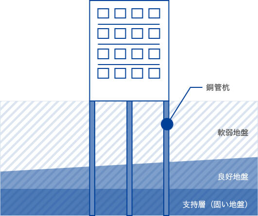 軟弱地盤や支持層がない場合でも、柱状体の周面摩擦力によって対応が可能です。